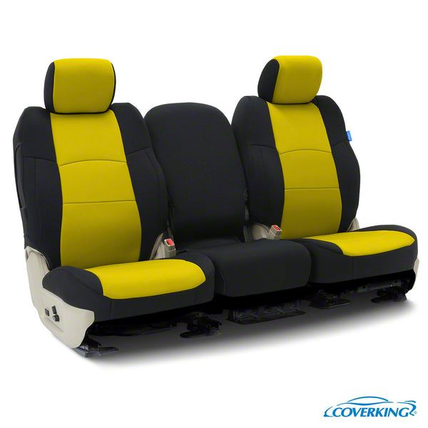 Construction and Appearance. Made from CR-grade neoprene, the same material used in high-end wetsuits, these seat covers offer a soft, cushioned feel while being extremely water-resistant. The dual-layer construction combines a waterproof neoprene inner core with a water-resistant Neotex outer shell. The bold yellow/black color scheme and precise custom-fit pattern give your interior a race-inspired, finished appearance.