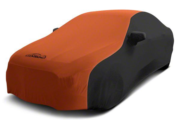 Description. Car Cover; Custom Vehicle Cover Satin Stretch; 2-Tone Black Sides Inferno Orange Center