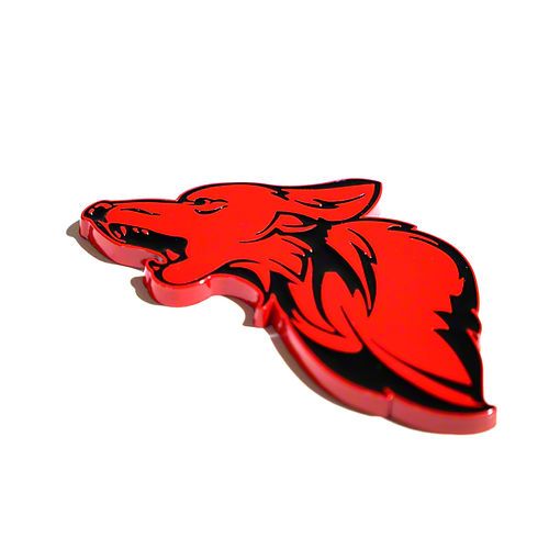 Stylish Coyote Badge. The Coyote Badge Shop GT500 Style V1 Floating Coyote Badge; Black with Red is a distinctive emblem designed to enhance the appearance of your vehicle. It replicates the iconic coyote logo in a floating badge style, making it an ideal accessory for automotive enthusiasts seeking to showcase their passion. This badge can be affixed to various locations such as the grille or decklid, adding a personalized touch to your car.