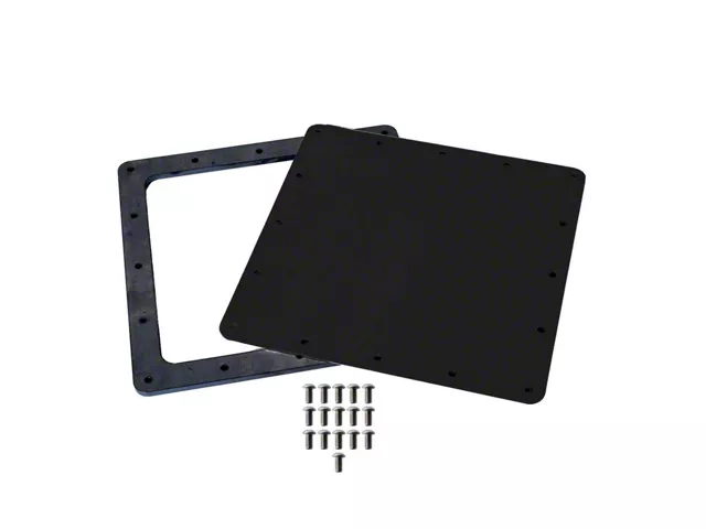 The Fuel Pump Access Door kit allows a bolt on cover to be located above the fuel pump so the fuel tank does not have to be removed to change or service the fuel pump. The inner opening clearance is 9” x 9” and includes a 1/4” thick steel weld plate with tapped holes and a 1/8” thick black anodized aluminum cover with stainless button head mounting bolts.