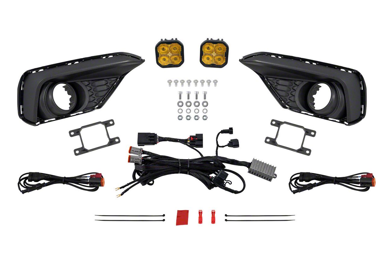 High-Performance LED Fog Light Kit. The Diode Dynamics SS3 Pro LED Fog Light Kit is designed to enhance visibility in poor weather conditions, providing SAE-compliant illumination. Producing a yellow light with a 3000K color temperature, this kit is ideal for cutting through fog, dust, snow, and rain. With an integrated amber backlight, it adds both functionality and an aesthetic appeal to your Ford Mustang EcoBoost.