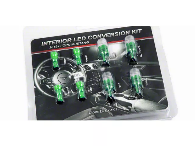 Application. Diode Dynamics’ Green Stage 1 LED Interior Lighting Kit fits all 2015-2017 Ford Mustang models.