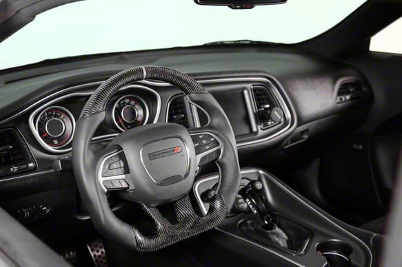 Strong Construction. The steering wheel combines the high-tech appearance of carbon fiber with the tactile comfort of leather grip inserts. This combination not only elevates the interior aesthetics of your Challenger but also improves your driving experience with a more comfortable and secure grip.