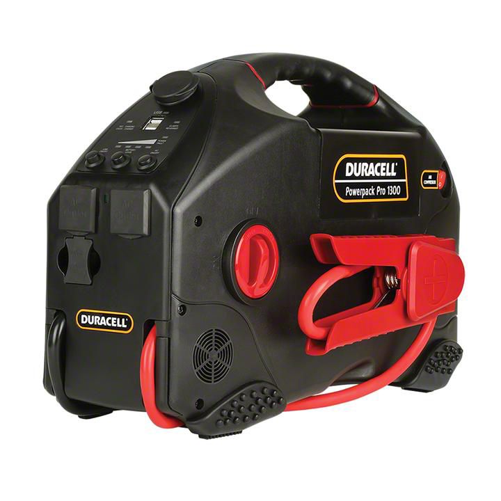 1300 Peak Amp Output. Never get stranded with Duracell's PowerPack Pro Jump Starter. This Jump Starter delivers up to 1300 Amp of peak power thanks to its internal rechargeable 18 Ah battery. The LED fuel gauge/battery level indicator conveniently shows the battery fuel level, so you always know when you need to re-charge. You can re-charge with the included AC battery charger. Included are built-in color-coded copper-clad 6 AWG jumper cables. RED: positive jump starting clamp that connects to the positive terminal. BLACK: negative jump starting clamp that connects to the engine block.