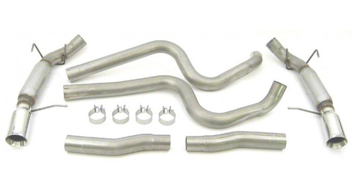 Enhanced Performance. The Dynomax Race Bullet Cat-Back Exhaust is designed to elevate the driving experience of your Mustang by providing up to a 4 decibel reduction in sound, while maintaining a deep, aggressive race tone. This system offers increased horsepower and torque compared to stock exhaust systems, thanks to its unrestricted straight-through design.
