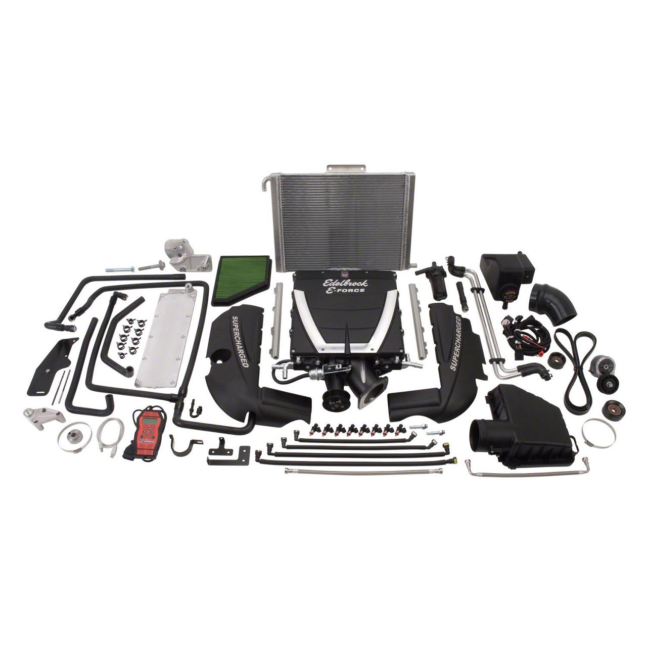 Complete Kit. This E-Force Stage 1 Street Supercharger Kit comes complete and includes the supercharger unit, high-velocity intake manifold, high-capacity air-to-water intercooler and low-temp heat exchanger, 52 lb/hr fuel injectors, fuel rails, 3.875 inch pulley, hoses, and wiring harnesses. It also comes with a recovery tank, intake tube, air box and air filter. A handheld programmer with Edelbrock calibration is also included for easier tuning.