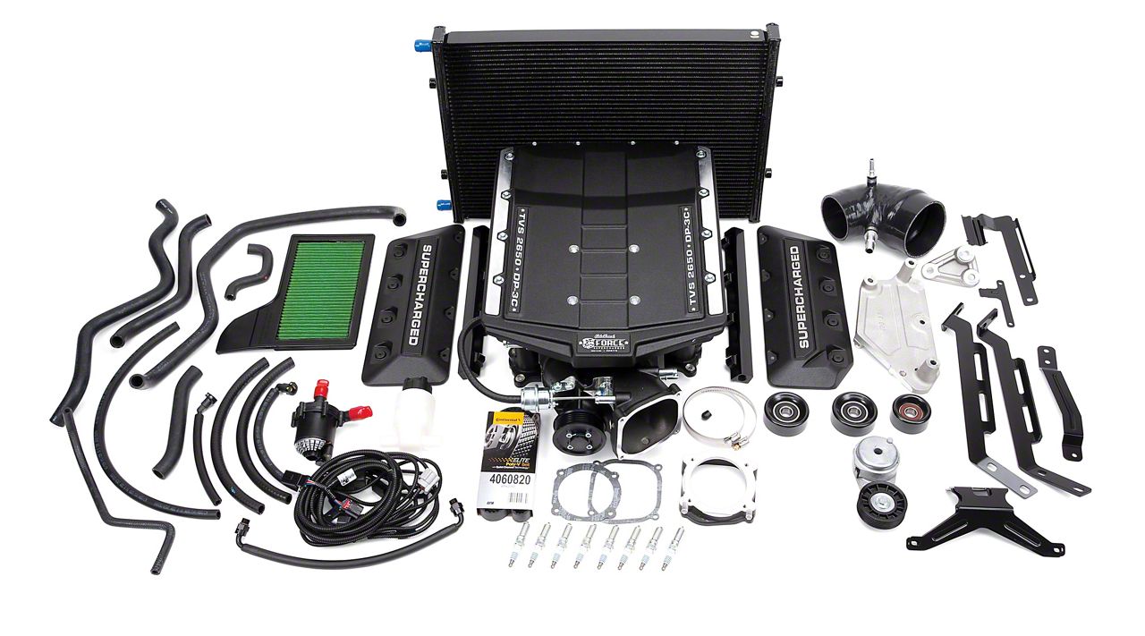 BY Edelbrock. Go with one of the meanest supercharger kits in the business with the premium grade Edelbrock E-Force Stage 1 Street Supercharger Kit without Tuner. It helps boost horsepower by 620 and pound-feet of torque by 510 with its highly efficient air-to-water, dual-pass, triple-core intercooler with a manifold assembly equipped with Eaton TVS 2650 rotors.