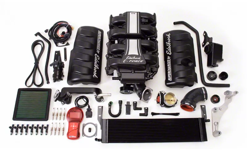 Complete Kit. Edelbrock's E-Force Stage 1 Street Supercharger System arrives 100% complete ready to be installed. The highlights of this kit include Edelbrock's Supercharger Manifold Assembly that features Eaton TVS Rotors, 3.875" Pulley, a Dual Core Low Temperature Heat Exchanger with 110 Sq-in Intercooler, Goodyear® Gatorback™ Serpentine Belt, an Electric Intercooler Water Pump, Extruded Aluminum Fuel Rails with 41 lb/hr Fuel Injectors, 85mm Electronic Throttle Body and a Handheld Tuner with tune files.