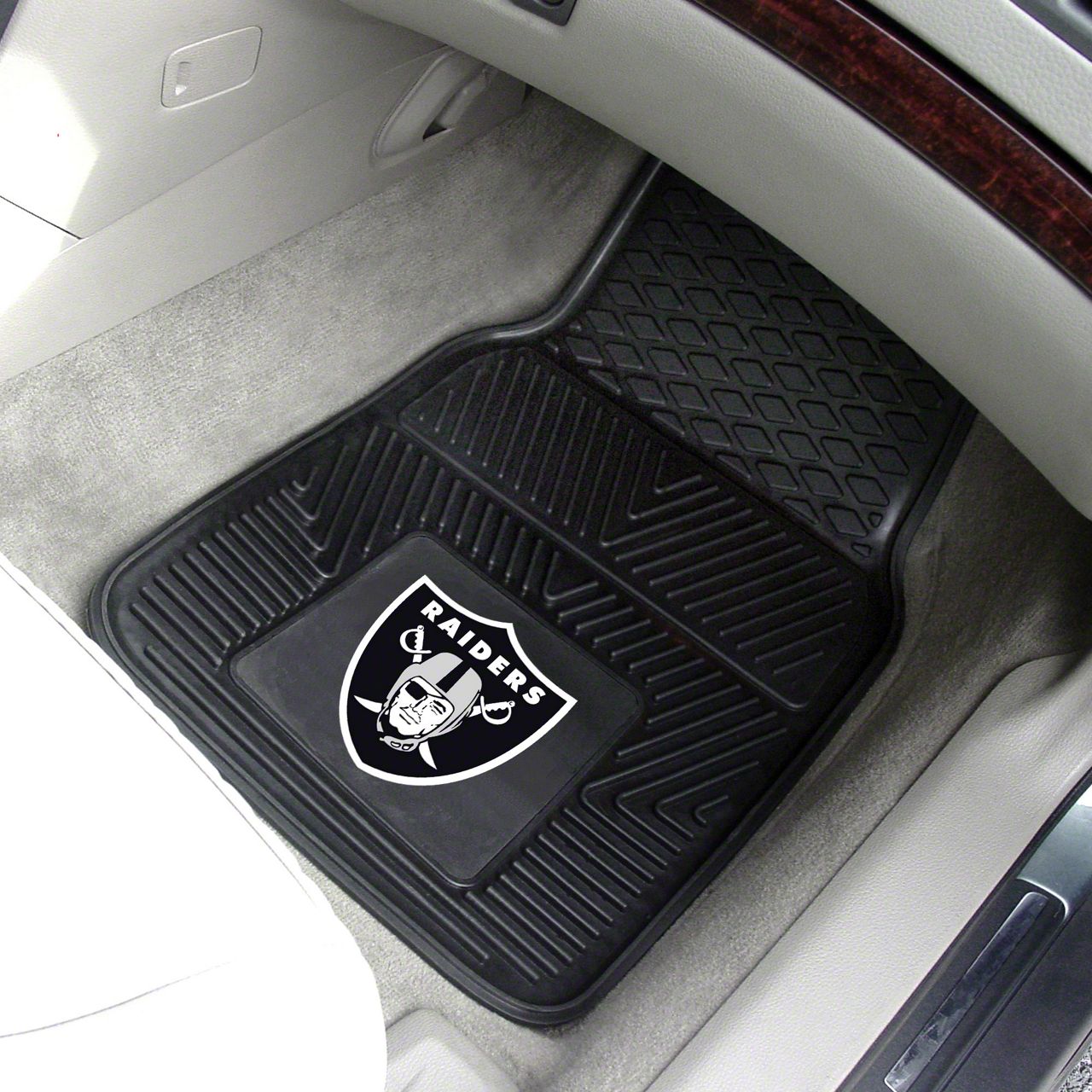 Vinyl and Non-Skid Composition. Add a sense of boldness and style to your vehicle with these Vinyl Front Floor Mats featuring the Las Vegas Raiders logo. These floor mats are made from rigid yet flexible vinyl, ideal for holding their shape and protecting floors from dirt and debris. The included non-skid Duragon latex backing helps keep the mats in place for added safety. Plus, the no-hassle installation makes it easy to get started.