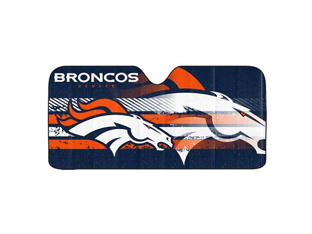 Application. This Windshield Sun Shade with the Denver Broncos logo is designed for universal fitment, but some adaptation may be required depending on the vehicle.