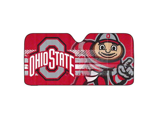 University Spirit Display. Show your love for your old University with the Windshield Sun Shade with Ohio State University Logo in Red. This sun shade features the Primary logo and image of the mascot of Ohio State University in full color with a vibrant red background. It measures 59-inch by 29.5 inches and will fit most windshields.