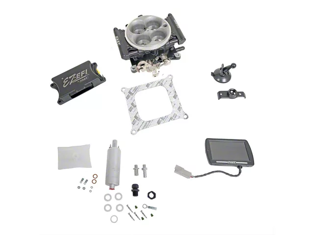 Description. The next generation of the world's simplest self tuning fuel injection system is here. Designed for all applications making up to 650 horsepower, the EZ-EFI Fuel system easily bolts onto any carbureted or multi-port application in a single afternoon, making it the easiest EFI system you will ever install. Simply hook up the system, answer the questions from the improved Setup Wizard on the color touchscreen hand-held unit, and the system will tune itself as you drive. The hand-held includes a variety of display dashes, a clean and easy to use interface and an LED indicator that can alert users to any errors (including overheating) or be used as a shift light. An updated wiring harness features a premium loom, added protective fuses and a streamlined design, while the ECU hardware has been updated to provide added protection against electrical/ignition noise and hardware damage. FAST EZ-EFI Fuel now features a die cast and black powder-coated four-injector throttle body with integrated fuel rails. It provides even better fuel distribution and more airflow than the original, and NO manifold replacement is needed. In addition to matching any 4150-style carbureted manifold, the EZ-EFI Fuel Self Tuning Fuel Injection System also works with your original carb-style throttle linkage and features OEM sensors, including standard GM versions available at any auto parts store. What?s more, it works with all ignition setups ? including HEI. EZ-EFI Fuel can be installed easily in an afternoon and is a ?must have? for your street rod or muscle car. For more aggressive applications, the EZ-EFI Dual Quad Upgrade Kit is capable of supporting 1200+ horsepower engines with dual quad carburetor-type manifolds. In addition, the Multi-Port Retro-Fit EZ-EFI allows owners of multi-port fuel injected applications to experience the benefits of EFI with no limit on horsepower because the system is based on each customer?s supplied injectors.