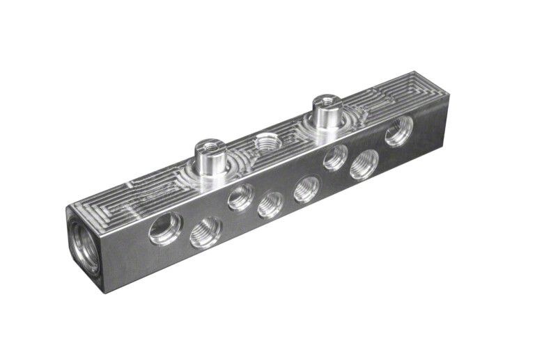 Our billet coolant distribution block is perfect for your custom twin turbo project. Made from solid T6061 billet aluminum right here in the USA. It features 4 options for inlet/outlet supply and 8 outlets that can be run to turbos or wastegates to keep them cool. Two mounting bosses are machined in to the back side.