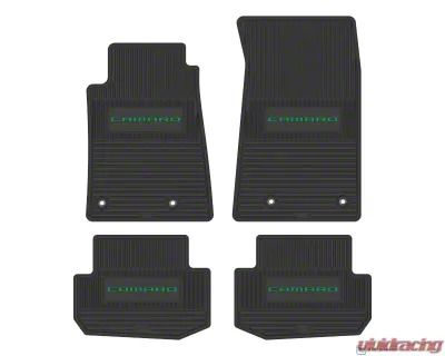 Application. These Factory Floorpan Fit Custom Vintage Scene Front and Rear Floor Mats with Green Camaro Insert; Black fit 2010–2015 Camaro models.