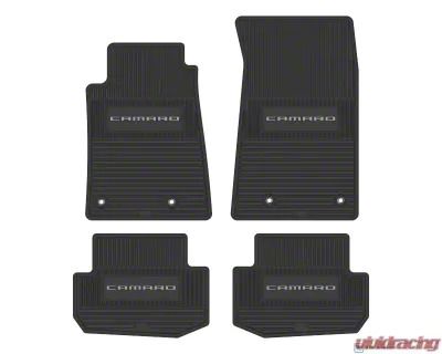 Construction and Appearance. Made in the USA, these mats feature a robust design with aggressive, deep tread profiling that ensures excellent dirt and moisture capture. Their black color with a tasteful silver Camaro logo insert offers a sharp vintage look, while the Sure-Grip backing keeps the mats securely in place without slipping.