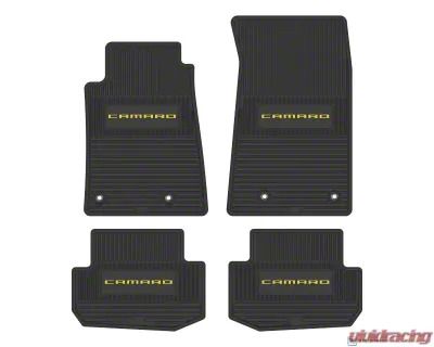 Application. This Factory Floorpan Fit Custom Vintage Scene Front and Rear Floor Mats with Yellow Camaro Insert fits 2010-2015 Chevrolet Camaro models.
