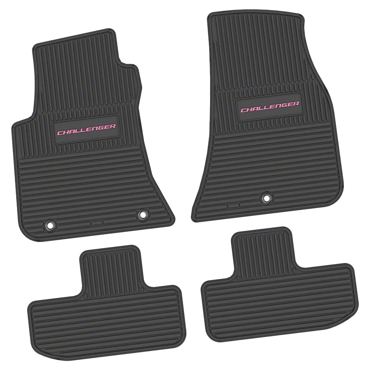 Stock Floorplan Fit. Made for the RWD Dodge Charger models, these FLEXTREAD Floor Mats come in sets of 4 with a matte black finish with a hot pink Challenger logo insert design. Built to protect your ride’s stock carpeting and upholstery, these floor mats have special channels that trap and keep liquid and other debris from reaching other parts of your ride. These floor mats also have an anti-skid backing that prevents them from slipping and moving on their own.
