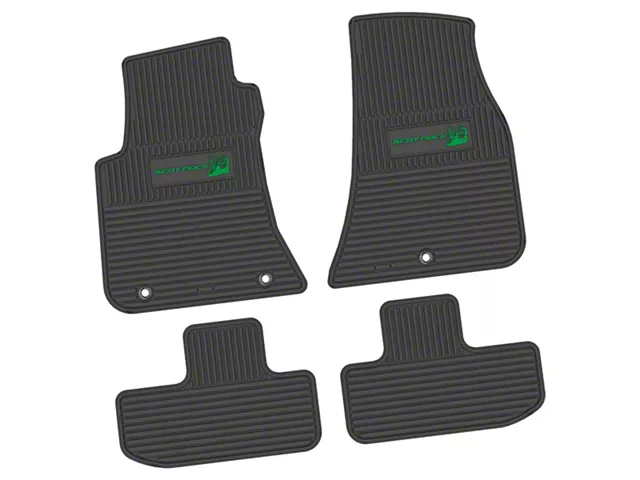 Stock Fit and Style. Made for the RWD Dodge Challenger, these FLEXTREAD Custom Vintage Scene Floor Mats come in sets of 4 pieces and have a textured black finish. Built as a front and rear model, these floor mats have green Scat Pack inserts that add a layer of design to these stock-styled mats.