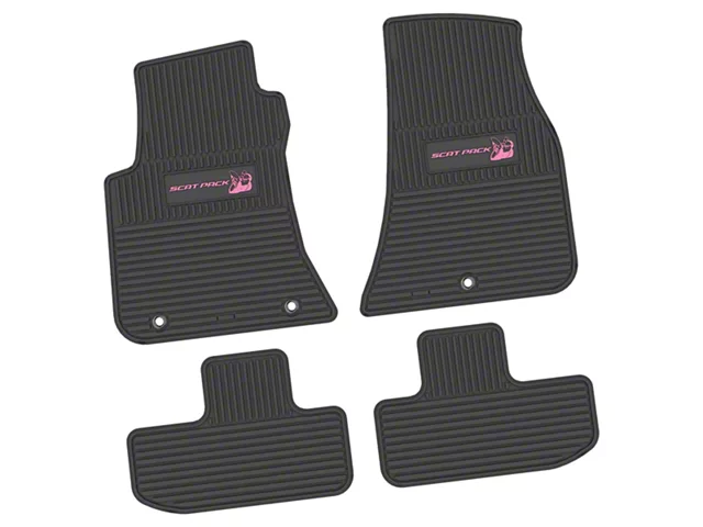 Application. The FLEXTREAD Factory Floorpan Fit Custom Vintage Scene Front and Rear Floor Mats with Pink Scat Pack Insert; Black fits 2011-2023 RWD Challenger models.