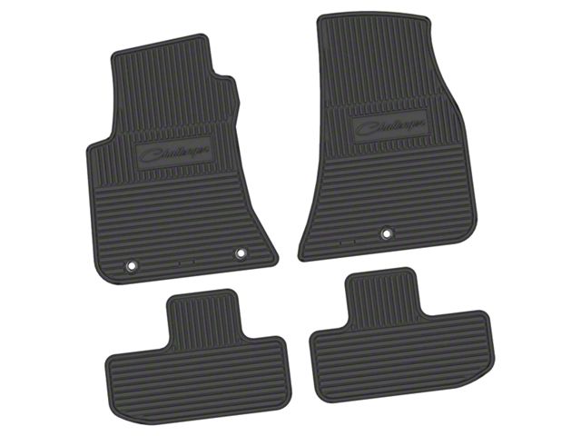 Application. This FLEXTREAD Factory Floorpan Fit Custom Vintage Scene Front and Rear Floor Mats with Challenger Script Insert (Black) fits all 2011-2023 RWD Dodge Challengers.