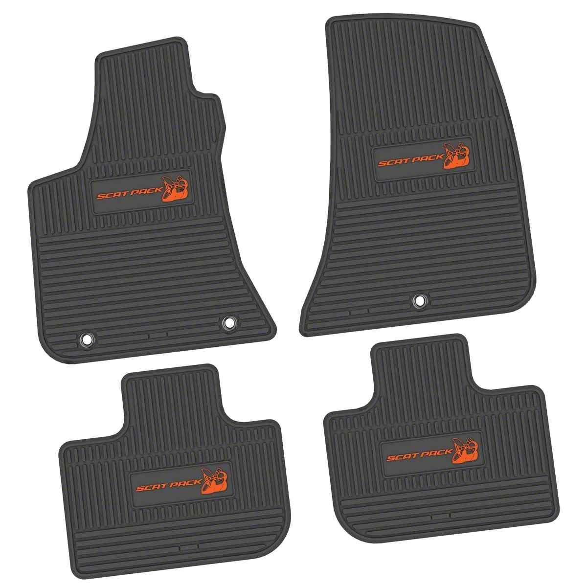 Application. This FLEXTREAD Factory Floorpan Fit Custom Vintage Scene Front and Rear Floor Mats with Orange Scat Pack Insert (Black) fits all 2011-2023 RWD Dodge Chargers.