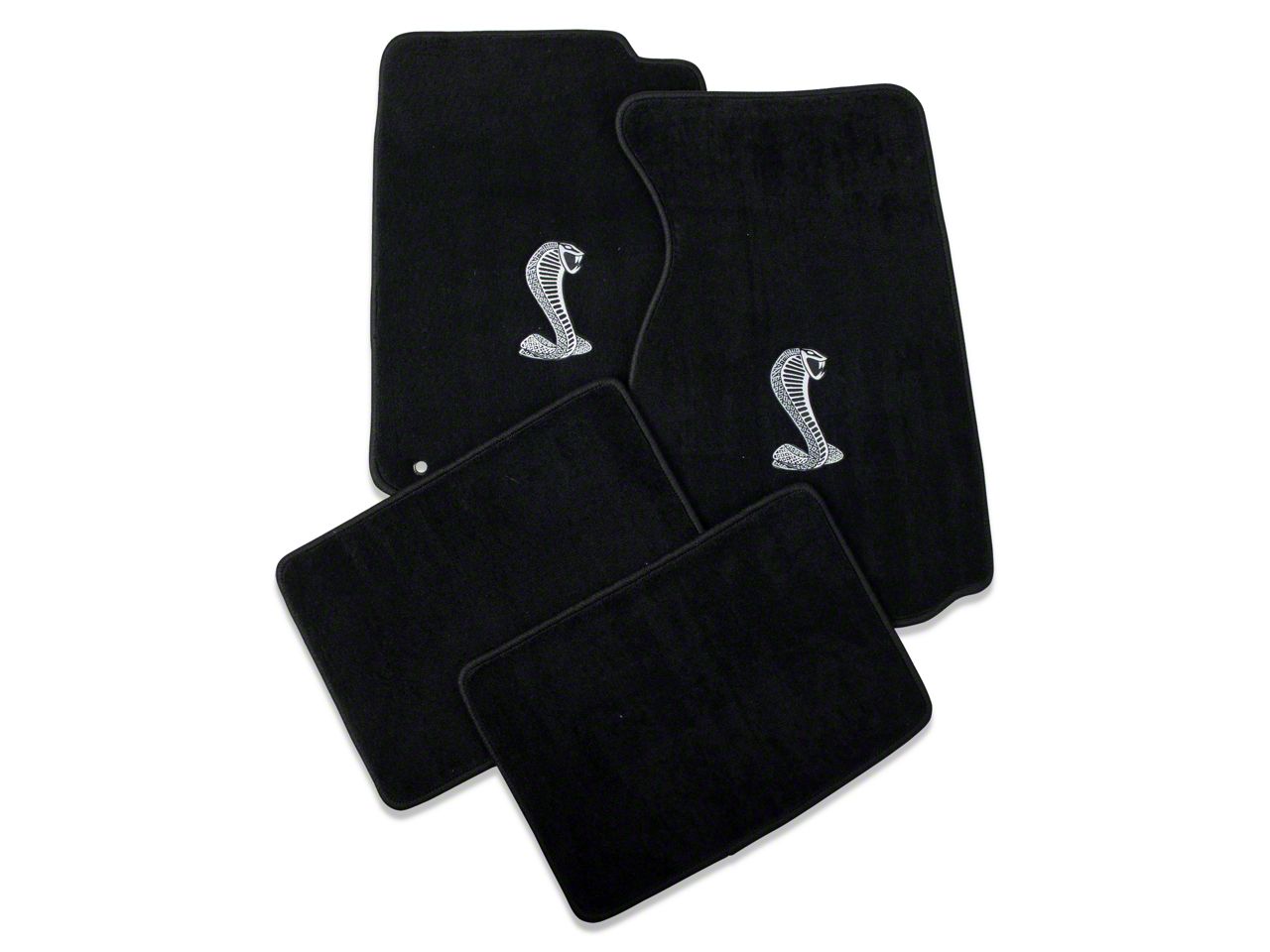 OEM Quality. These black floor mats are die cut from long lasting cut pile carpet for a perfect fit and are finished with a stitched trim for great looks. The Cobra logo is superbly embroidered on the front two mats for impressive styling.