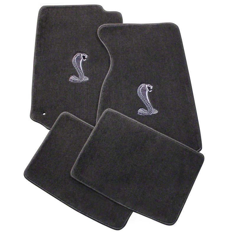 OEM Quality. These gray floor mats are die cut from long lasting cut pile carpet for a perfect fit and are finished with a stitched trim for great looks. The Cobra logo is superbly embroidered on the front two mats for impressive styling.