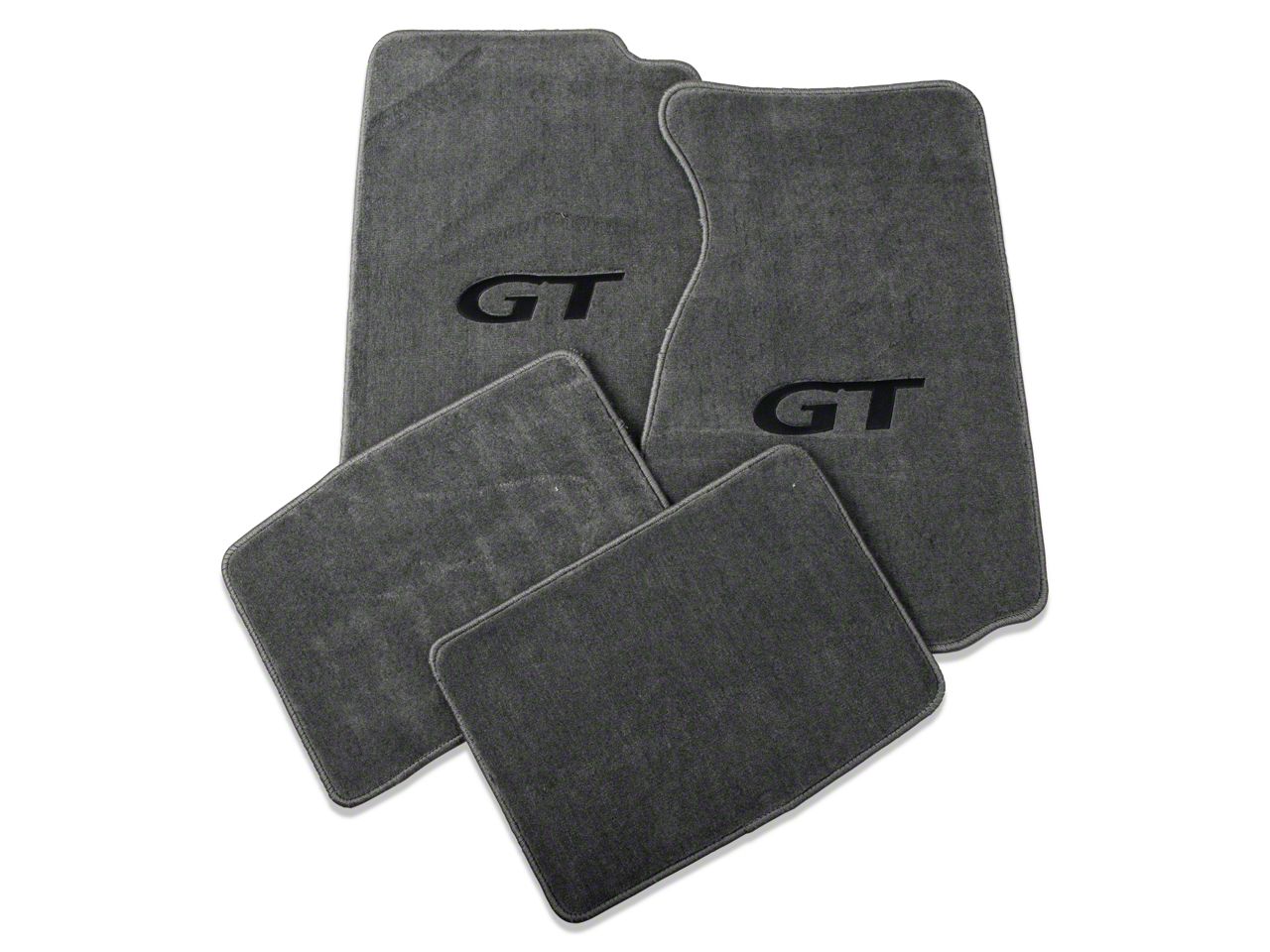 OEM Quality. These gray floor mats are die cut from long lasting cut pile carpet for a perfect fit and are finished with a stitched trim for great looks. The GT logo is superbly embroidered in black on the front two mats for impressive styling.