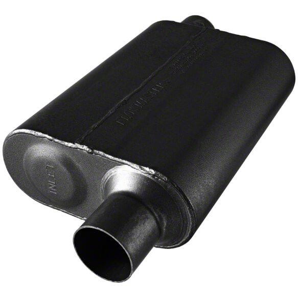 Effective Exhaust Repurposing. Level up your mean machine with the Flowmaster Super 44 Series Offset Oval Muffler. This aftermarket exhaust effectively scavenges outgoing exhaust gas for re-usable fuel particles, adding mileage and resilience to your vehicle.