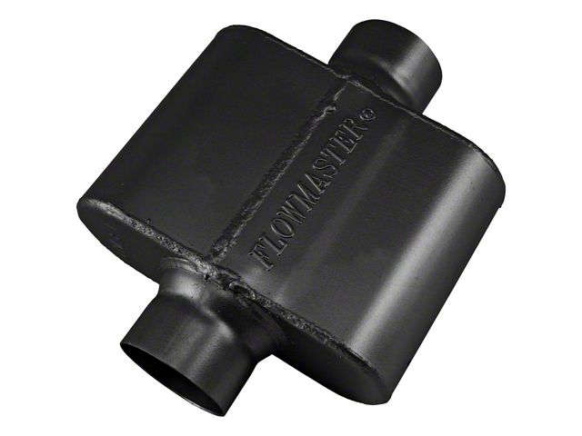 Construction and Appearance. Finished in matte black, this muffler is built with durability and aggressive styling in mind. Its compact design and center/center 3-inch inlet and outlet configuration allow it to handle extreme racing conditions. With no internal packing to wear out or blow out, it delivers long-lasting performance without compromising flow.