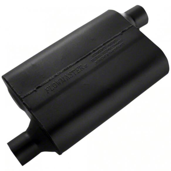 High Flow Design. If you're in the market for a new muffler to style your car, than look no further than this Flowmaster Original 40 Series Offset/Offset Oval Muffler; 2.25-Inch Inlet/2.25-Inch Outlet. Designed for strength and style, it features a rugged chambered design that gives way to better exhaust while its 16 gauge steel exterior allows it to tolerate prolonged use in high heat, high vibration applications.