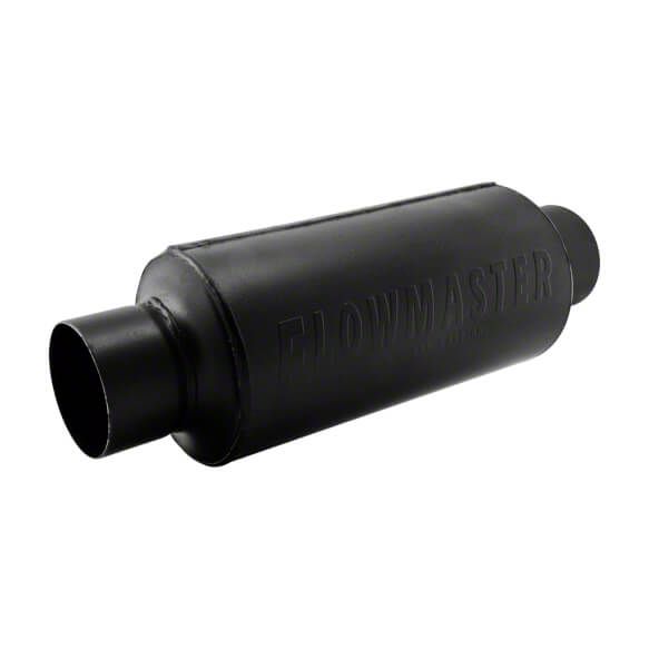 Aggressive Sporty Design. Weather its on the road or on the dirt, go all out with this Flowmaster Pro Series Shorty Center/Center Bullet Style Muffler; 3-Inch Inlet/3-Inch Outlet. Designed for pedal-to-the-metal riding and high flow applications, this Bullet Muffler features a centered stainless steel architecture that greatly improves exhaust to almost the level of open pipe rigs, perfect for those who want to get the most out of every drop of fuel.