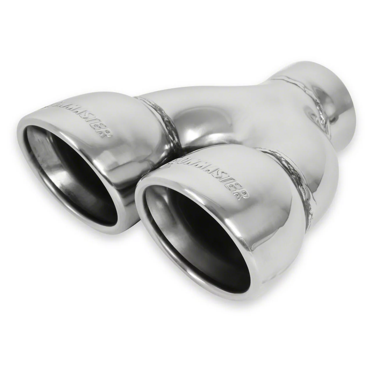 Exhaust tip, logo embossed polished stainless, rolled edge angle cut, 3.50 in. dual pipe diameter x 2.50 in. x 7.50 in., weld on. Sold individually.