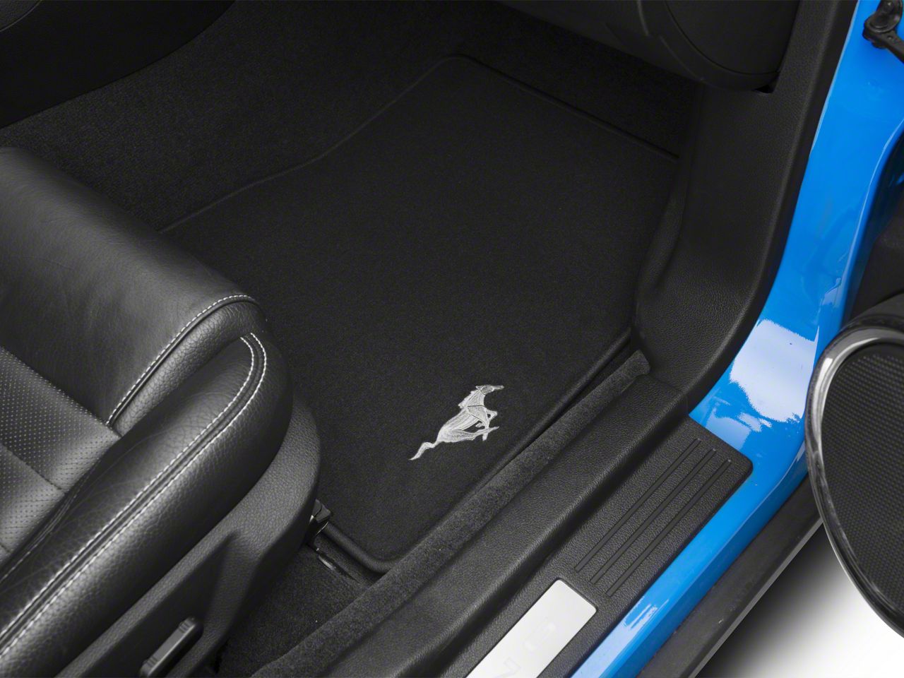 OEM Quality Materials. Die cut from long lasting cut pile carpet for a perfect fit, these black floor mats are completed with a stitched trim edge for a great finished appearance. The Running Pony logo is superbly embroidered on the front two mats in silver for impressive custom show car styling.