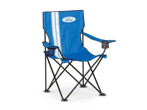 Quality Construction. Manufactured from high quality steel tubing with a black powdercoat for corrosion resistance, this Folding Chair features a Ford logo on the chair back. Complete with a mesh cup holder on each arm rest, the blue 600 denier polyester fabric features contrasting white stripes to increase it's visual style.