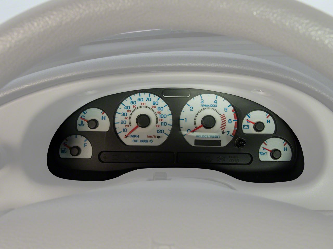 Application. This genuine Ford replacement instrument bezel with attached clear lens will fit all 1999 to 2004 Mustangs including the V6, GT, Bullitt, Mach 1 and SVT Cobra models. Will not fit 2000 Cobra R.Note. Gauges are not included.