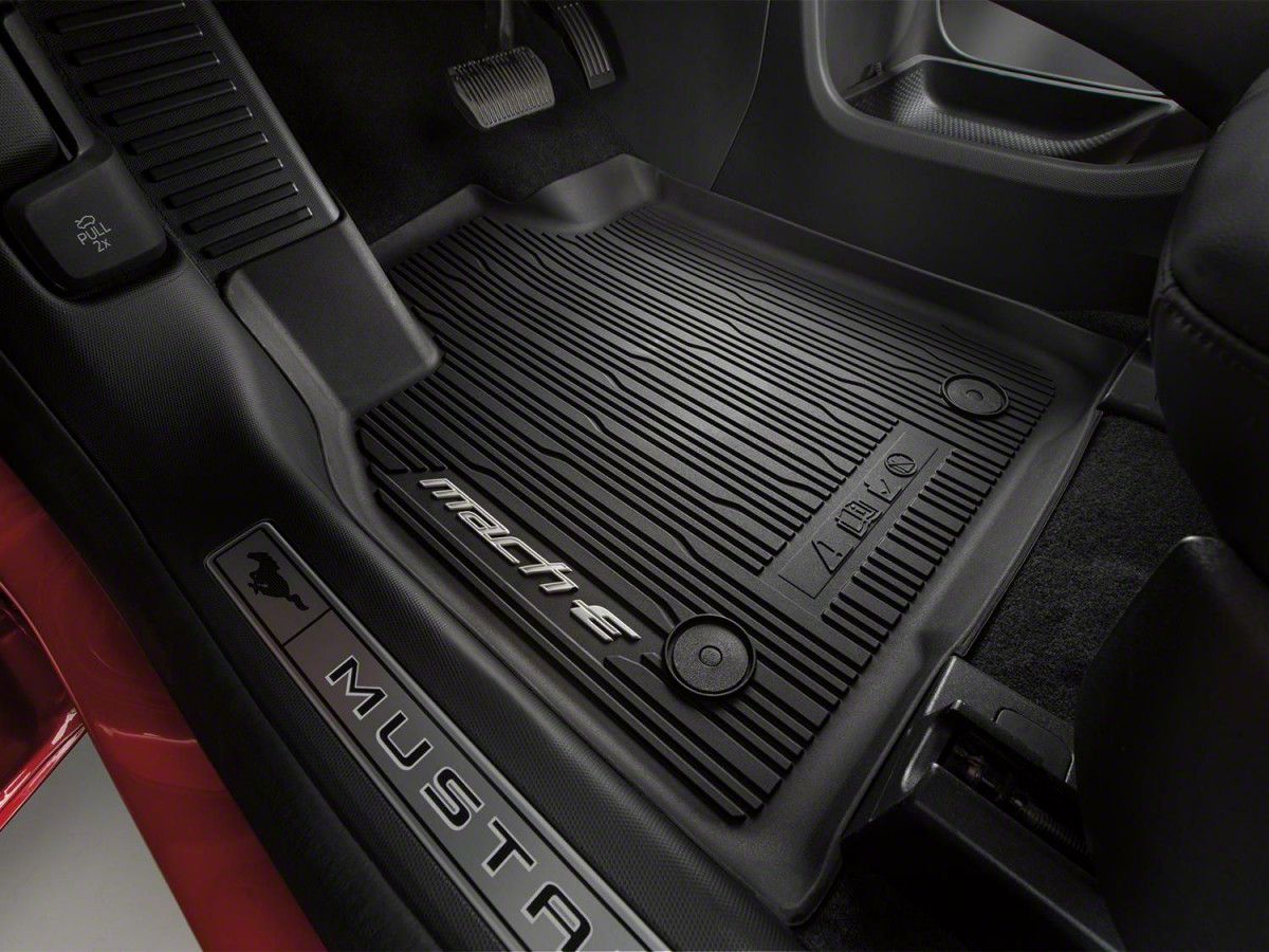 Application. The Ford All-Weather Front and Rear Floor Mats are manufactured to accurately fit 2021-2025 Mustang Mach-Es.