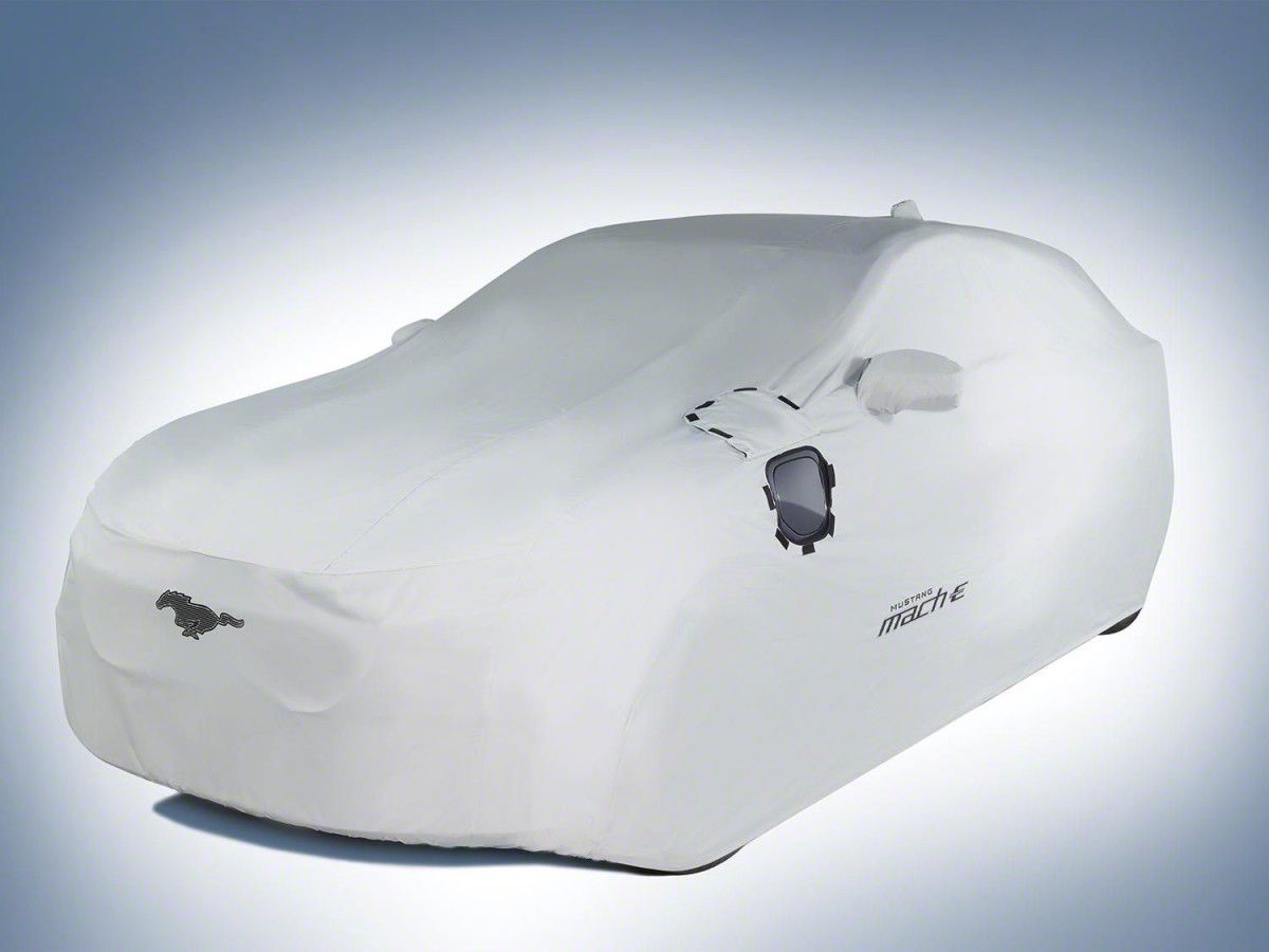 Protective Vehicle Cover. The Ford Car Cover with Charge Port Access offers full coverage designed specifically for the Mustang Mach-E. It helps protect the vehicle from environmental elements while allowing easy access to the electric charge port, maintaining convenience during use.