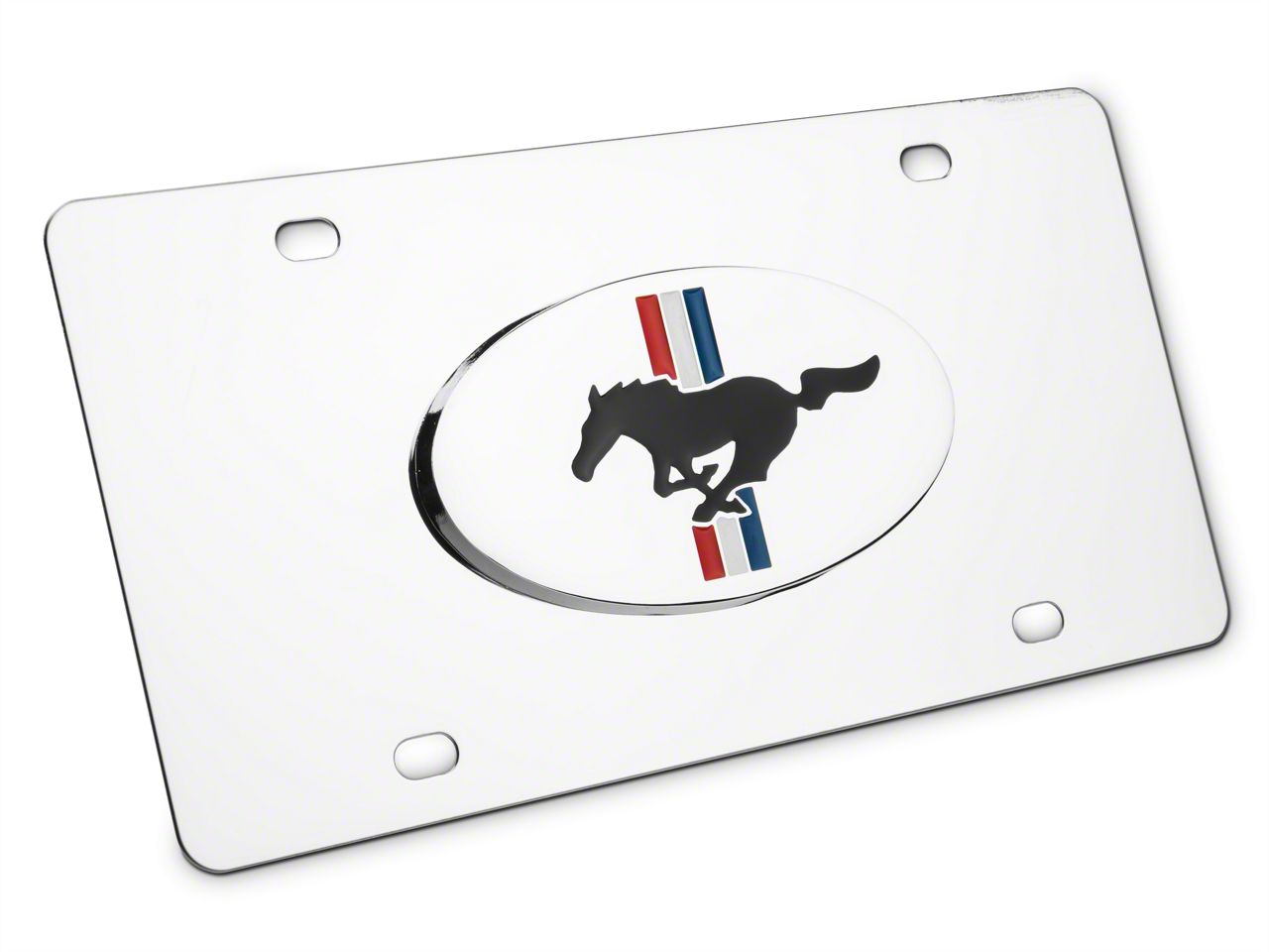 Quality Construction. This License Plate is constructed 100% from stainless steel and has been polished to a bright mirror finish. The 3D emblem is made out of solid brass and has been chrome plated for long lasting longevity. The tri-bar and running pony logo has been rotary-engraved and epoxy-filled, to give the logo a bold contrasting appearance.