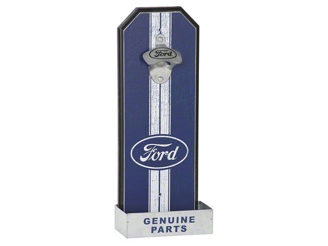 Bottle Opener. This Ford themed Wall Mount Bottle Opener with removable cap catcher is ideal for your home bar, garage, or where ever enjoy a cold one. This functional accent piece features metal and wood construction and includes mounting hardware.