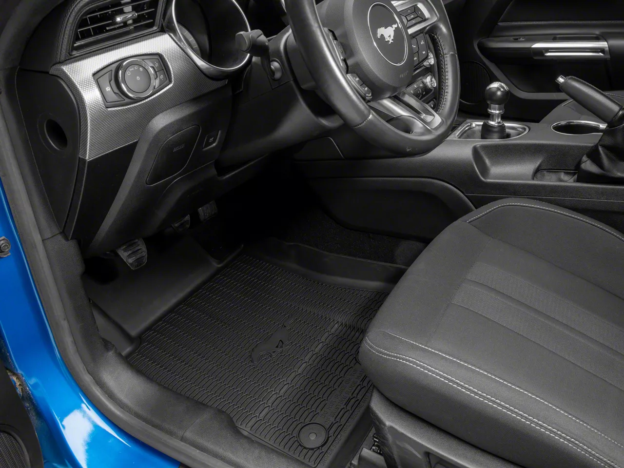Application. The Ford All-Weather Front & Rear Floor Mats with Running Pony Logo - Black is compatible with all 2015-2026 Ford Mustangs.