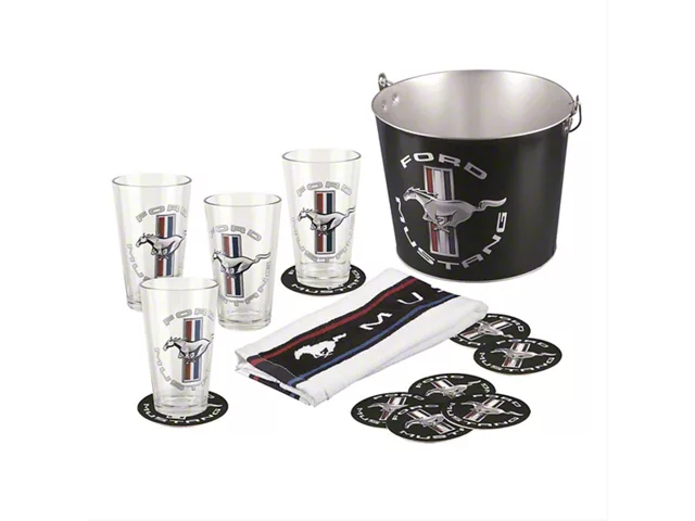 A Full Bar Set. You'll have everything you need for enjoying the bar with your buddies with the Ford Mustang Party Bucket Set. The 18-piece set includes 4 pint glasses, 12 coasters, a 5-quart metal bucket for ice or beer, and a 100% terry cotton towel. Each piece is proudly emblazoned with Mustang logos.