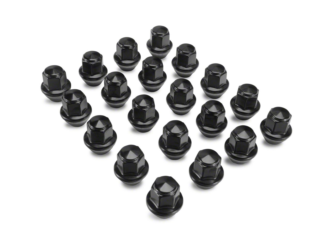 Simple Yet Functional. This Ford Performance Black Lug Nut Kit helps boost the appeal of your Mustang's wheels, whether it’s the stock rims or a unique aftermarket set. There are 20 lug nuts included in this kit, enough for a complete set of 5-lug wheels. The black color matches most rim designs and style, so you’re free to pick what really suits your taste.