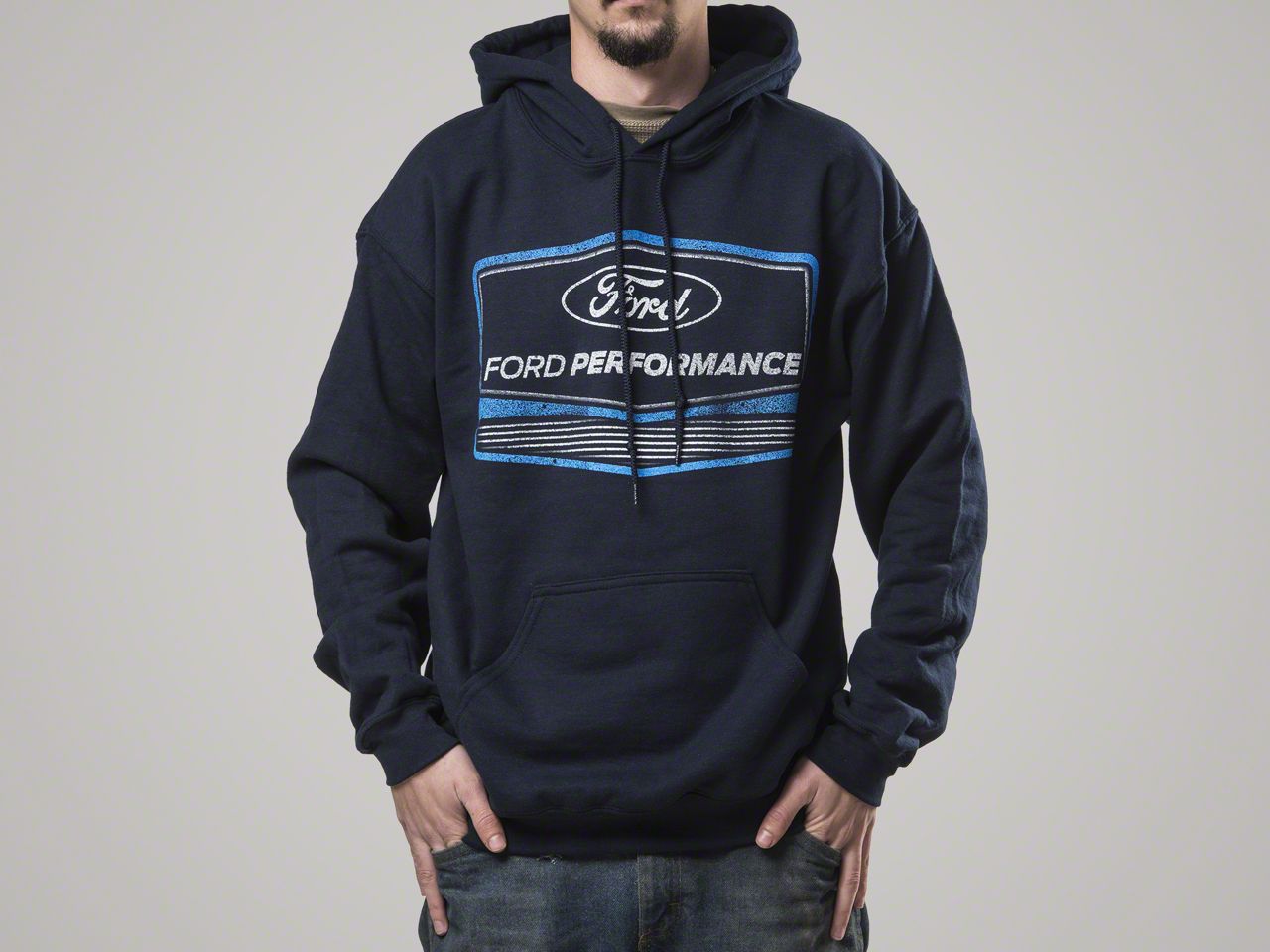Performance Hoodie. Proudly display your love for Ford with an Officially Licensed Navy Hoodie. This heavy blend Ford Performance Sweatshirt will keep you warm and comfortable even on the coldest days. Featuring the Ford Logo in white as well as Ford Performance written across the front of the chest, this navy blue drawstring hoodie features a lighter blue and white detailing surrounding the logos', similar to that of a Ford grille. This pull over style Ford Performance Hoodie with front pouch pocket is the perfect piece of outerwear for cool morning drives, fall car shows or random cruise nights.