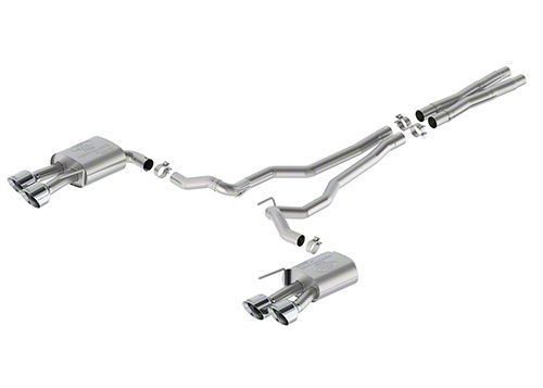 Construction and Appearance. Crafted from high-quality 304 stainless steel, this cat-back exhaust system is built for durability and corrosion resistance, ensuring long-lasting performance. The dual chrome tips provide a sleek, polished look that complements the included Dark Horse Quad Tip Rear Valance, giving your Mustang a custom, high-performance appearance.