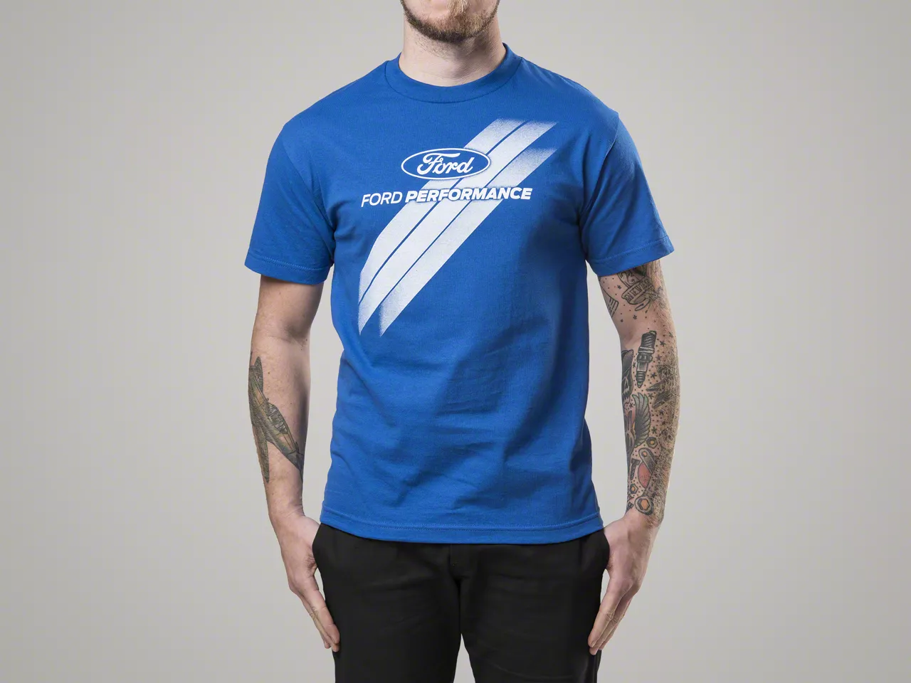 Striped Tee. In a man's world, you can never have too many t-shirts. Add this Ford Performance Blue and White Stripe Tee to your own wardrobe or gift it to your favorite Ford lover. Featuring the Ford Logo and Ford Performance written across the front, white triple slanted stripes make this blue cotton t-shirt one of a kind.