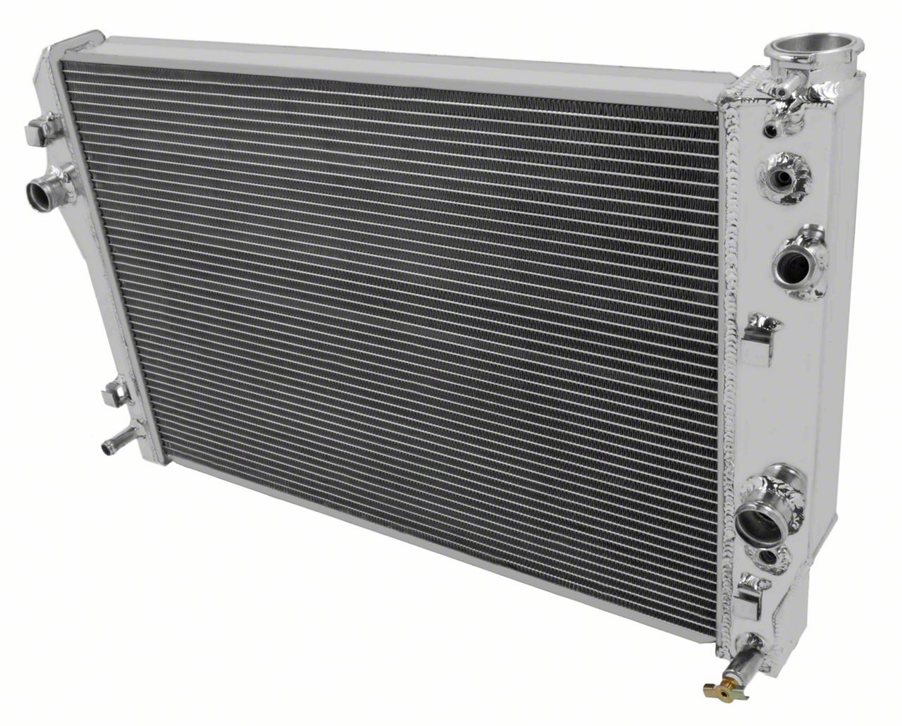 Construction and Appearance. Crafted from aircraft-quality aluminum, the radiator features fully TIG welded seams for strength and durability. The raw aluminum finish gives it a clean, performance-ready look. Measuring 20-1/2 by 29-5/8 inches, it includes a 1-1/4 inch inlet and 1-1/2 inch outlet to support high flow rates while remaining up to 30% lighter than stock components.