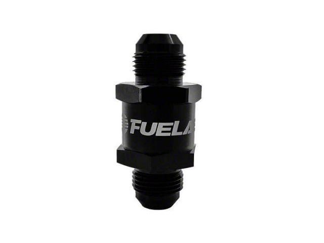 Application. This Fuelab Check Valve features a universal fit, suitable for use in high-performance, racing, or aftermarket fuel systems requiring a one-way high-flow control solution. Ideal for maintaining consistent fuel pressure and preventing backflow, it enhances system reliability and efficiency. With its glossy black aluminum construction, fluorosilicone seals, and rebuildable design, this check valve provides professional-grade performance and long-term dependability for any advanced fuel delivery setup.