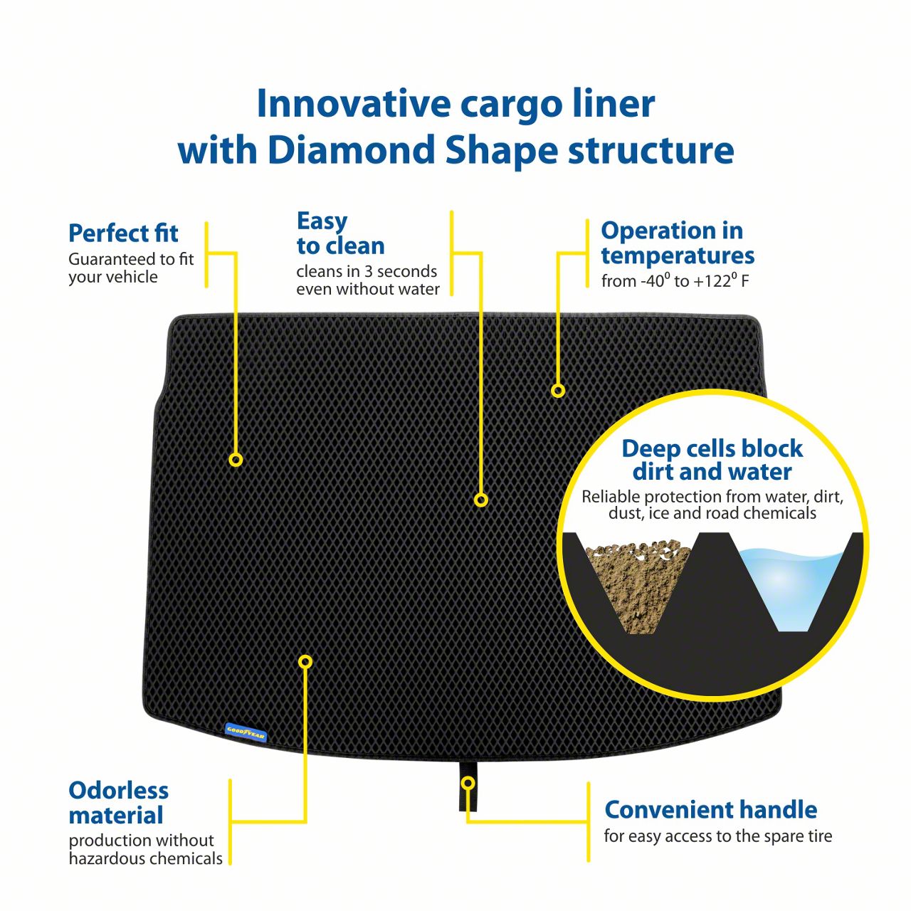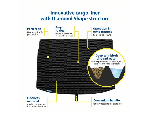 Heavy-Duty Construction. This cargo liner features a heavy-duty rubber compound that works in temperatures from -40 to 122 degrees Fahrenheit. The Diamond Shape technology used features cells that trap dirt and liquids that may somehow find their way into the trunk, and effectively keep these away from your luggage. This liner also features a convenient lift handle to make it easy to access the spare tire or remove the liner for cleaning.
