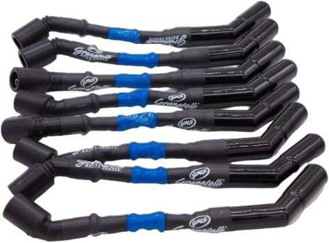 Premium High-Performance Wires. The Granatelli Motor Sports High Performance Spark Plug Wires with Ceramic Boots; 8-Inch; High Temp Blue deliver powerful ignition spark energy for enhanced throttle response and efficient combustion. Designed for professional use in confined engine bays, they support high-performance street and racing applications where precise spark delivery is crucial for maximizing horsepower.